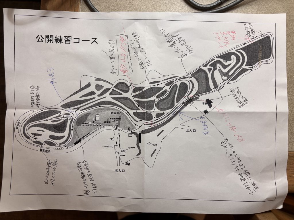 初日は公開練習を走り終えれば全て終わりではなく、私の場合は今回からホテルに到着してからも何度も車載映像を見返して気づいたことなどをコース図に書き込むことでより精度の高い走りができるように工夫しました。コース図にいろいろと書き込まれている理由はこれですね。